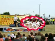 下午三点半左右,轮到大法弟子们的节目了。学员们首先将两面横幅挂在台上,一面写着“世界需要真、善、忍”,另一面写着“法轮大法好”。一位西人学员在台上作了简单的介绍后,学员们开始表演第一个节目——扇子舞“数点梅花天地春”,接着,在台上作了功法表演,一位西人学员同时向观众介绍法轮功,以及法轮功在国内遭受的迫害,和江××被告上美国联邦法庭的正义之举。最后,在一台“法轮大法好”的扇子舞中,学员们结束了长达30多分钟的表演。
