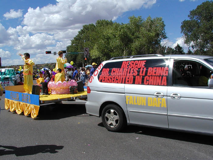 九月七日,科罗拉多和新墨西哥州大法弟子参加了桑特菲(SANTA FE)大游行。这次游行采用了科罗拉多第二代花车设计,花车光彩夺目,设计新颖。花车上中西裔大法学员不停地演示法轮功功法,花车四周装饰了“法轮大法好”“真善忍”横幅标语。