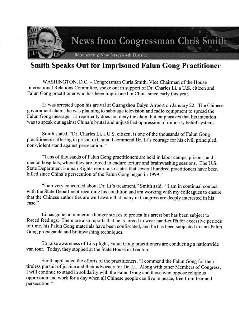美国会议员克瑞斯-史密斯声援法轮功学员李祥春