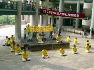 4月24号,我们按照第一次面谈时说好的,又去了教育学院,他们不但不给答复还来了大批警察强行驱赶炼功人。我亲眼看见两个警察拉着一个60多岁的男学员,一人拉着一条腿,头在地上被擦破流着血。这个60多岁的男学员哭着说:“我不走。”我还看见四个警察把一个60多岁的女学员,两个警察拽胳膊,两个警察拽腿,扔到大门口处,她半天才缓过气来。话还没说被抓走的。