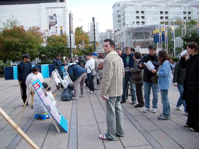 除不定期進行酷刑展以外,温哥华学员借鉴在纽约曼哈顿向世人讲清真象的做法,加强了向市中心商业区讲真象的力度,平时三三两两在DOWNTOWN 的主要街道、街口,摆上一块展板,炼功,发真象资料,效果也是非常好。