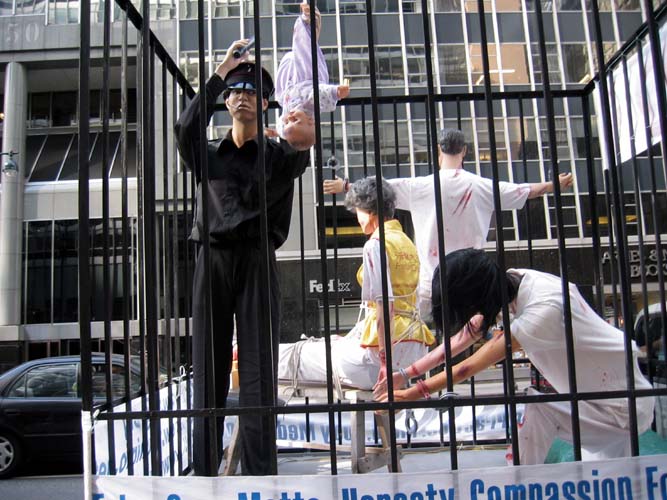 三个美国青年,两男一女,不到二十岁的模样,肩上还背着书包,看来是学生。他们从车上一下来就看到了反酷刑展。他们停留在展板前,一一细看展板上的图片和介绍,最后,他们来到扮演受酷刑学员的面前,看了她满身伤痕(化的妆)、双手被吊着,非常难过。他们充满稚气、纯真的脸上充满了愤怒,指着扮演恶警的学员问“这是不是你干的,如果真是你干的,我们决不饶你,我真要狠狠的揍你一顿,也让你和她(指扮演受酷刑的学员)一样,尝尝那个滋味。”发资料的学员赶忙向他们解释:“这里是模拟在中国发生的迫害的情况,在中国那些警察就是这样残酷迫害法轮功学员的。”三个学生听了后才没有动手。