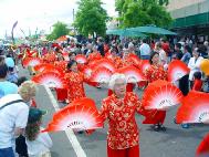 | 小弟子手持“真善忍”走在游行队伍的最前面 | 扇子舞和红绸舞表演 | 法轮大法的展示摊位 |