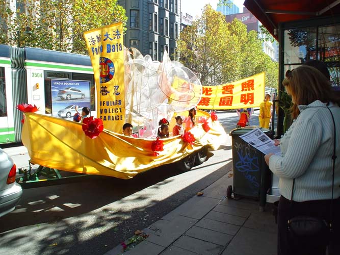 当经过一夜旅途颠簸前来参加游行的悉尼法轮功腰鼓队整齐的亮相于第一方阵时,马上吸引了来自四面八方的行人。他们和彩绸舞一同为市民们带去了中国传统文化精髓,也拉开了此次游行的帷幕。
