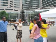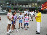 有一位男士在展板前长时间的仔细阅读了每个展板,后来向学员介绍说他曾是大赦国际的成员,表示愿意去联系当地的大赦国际寻求帮助,并提供了一些当地人权组织的联系方式。一些有缘人在了解真象后对法轮功功法产生了很大兴趣,向学员询问在哪里可以学炼法轮功,更有人当场开始学炼起来。