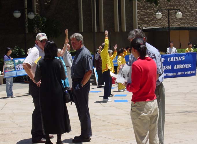 ![]() 美国天主教大学教授聂森博士在发言 | ![]() 西人法轮功学员杰拉德在发言 | ![]() 西人法轮功学员向路人讲真象 |