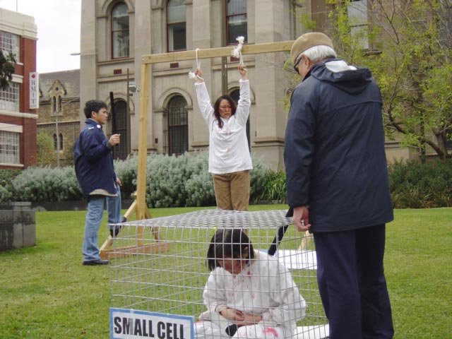 酷刑一隅行人关注维多利亚州图书馆位于市区主街Swanston St 和 Latrobe St 的交汇处,每逢周末总会有络绎不绝来此参观阅览的人们;两街间还不断的穿梭着周末休闲逛街的人们。法轮功学员所展示给行人的场面让来往匆匆的人群放慢了脚步,注视着眼前发生的这一切。十多种在中国大陆被用于迫害法轮功学员的酷刑被淋漓尽致的以图片、照片和文字说明形式展现在酷刑展牌上:钉死板、别扭扣双手、强制灌食、冷热窒息、压刑、囚笼、烧烫、钉竹签、坐、吊刑、强制定位和电击等;真人拟实演示更加引人关注。人们在震惊于信仰“真善忍”的法轮功学员所遭受的无人性的迫害的同时,也在不解的向学员询问为什么江××要发动这场迫害。学员们耐心细致的向他们说明了这场迫害的真象。其中一名学员说:“江××发动了迫害是因为它是个无视人民疾苦只重自我权力的妒嫉心极强的独裁暴君”。学员们还向关心的人们進一步讲述了江氏集团的这种国家恐怖主义扩张到海外的事例,并着重介绍了江氏集团雇凶杀人的南非枪击案。
