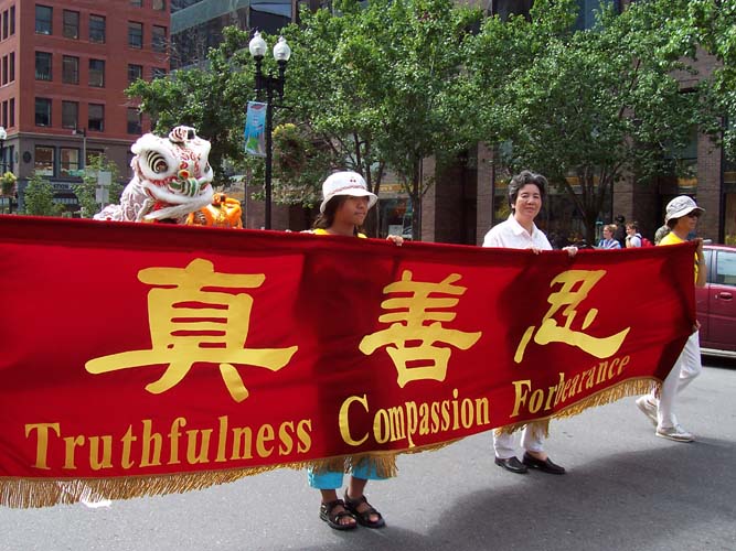 记者在报道中说,当然,不是民主党人士赞成这三个字,这是遭受迫害的法轮功学员们的信守准则。数千名法轮功学员们正在游行穿过波士顿市中心。