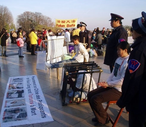 在营救中国受迫害法轮功儿童的背景音乐声中,手持麦克风的主持人分别用英、法文向观众介绍法轮功功法,讲述发生在中国大陆的迫害真象。在广场上,真人模拟反酷刑展吸引了众多的游客围观;旁边身穿黄色炼功服装的学员们正在整齐的展示功法;真象展板旁的莲花台前围满了来学做纸莲花的孩子们;几幅揭露中共迫害法轮功儿童的美展油画作品也吸引了喜爱艺术的人驻足观赏;铺在地上的白布因为签满了名,换了一块又一块……这些不同类型的同步展示共同烘托出了一个正义的主题:停止迫害法轮功,营救受迫害法轮功儿童!