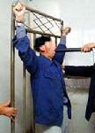 吊刑3) 此种酷刑(又叫一字铐)是将学员双臂平衡抻至极限,横铐在铁门上,长时间施以此刑会使受刑者肩胛脱臼,手臂僵直,不能正常活动。
