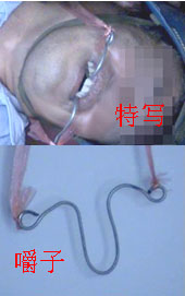 为了防止大法学员说话,恶警们用粗铁丝围成一个带尾巴的凹型圆塞进大法学员的嘴里,压到舌头面上,再延伸到嗓子眼儿处,又用绳子把这个嚼子系到脑后勒紧固定住。上了这种刑具后使人马上感到恶心呕吐。然后恶人把录音机的耳塞子塞到大法学员的耳朵里,音量放到极限,逼迫大法学员听诽谤之辞。凶残的恶警在给大法学员戴嚼子的同时,还踩着大法学员的颈部和脸部,电击颈部。