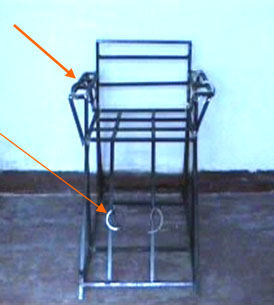 凡是不“转化”的、不配合其它酷刑迫害的,就给你长期固定在此大铁椅子上,用各种酷刑迫害,最残忍最野蛮的是用粗管子插在受刑者喉咙处来回拉、来回插,并把嘴用撑子撑开,把牙压倒流着血灌食,大多数受刑者都被折磨得四肢僵直,眼球上翻。箭头标注处均有用来固定身体的铁环。