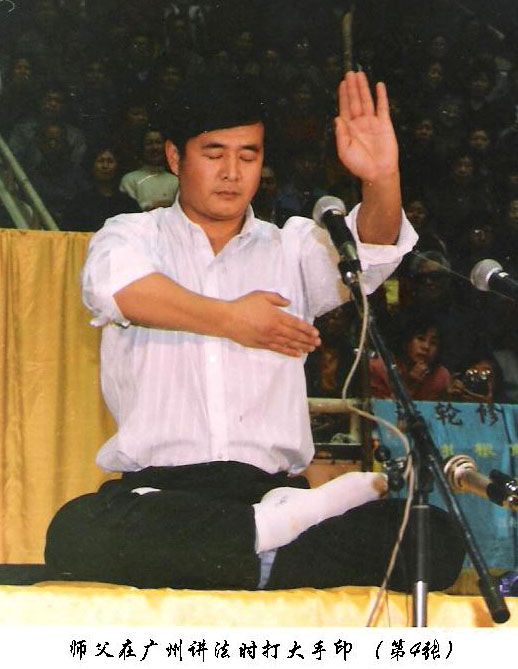 当时参加这次广州法轮功讲法班的学员有五千多人,是师父系统的教授法轮功的学习班中场面最宏大的一次,都是人传人、心传心,大家自觉自愿去的。我是在快开班前一天才决定去的。当时正上大学三年级,克服了很多阻力:请假不准,坐不上车,中途转车又买不上票等。到了之后,入场票已售完(以前参加过班的,票价一半——25元)。晚上开班前,没有入场的学员有近1000人,在场外集体炼功,等候师父的到来。师父一出现,大家非常激动。师父与主办单位协商把学员们排队带进来,但主办单位以盈利为目地不同意。师父在开始讲课前,来到入口处,看望在外面等候排队入场的学员们,足足有五分钟,面带微笑,慈悲祥和的看着大家。我们都激动的鼓起了掌。