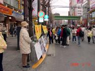 【明慧网2005年2月16日】秋叶原是日本最繁华的电器街,来往的人特别多,日本法轮功学员5年多来坚持在这里向日本民众和中国大陆来的旅游团讲清法轮功真象。农历新年期间来自中国大陆的旅游团很多,2005年2月13日,法轮功学员们摆好了真象图片,向过往的人们发资料,讲真象。
