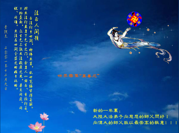 在这新春即将来临的时刻,捎去弟子对您的问候,弟子无法用语言表达师尊的再造之恩。在这新的一年里,我们会更加精進的做好三件事,放下人心,用正念看待修炼过程中的事情,紧跟师尊正法到底,迎接法正人间的伟大时刻。