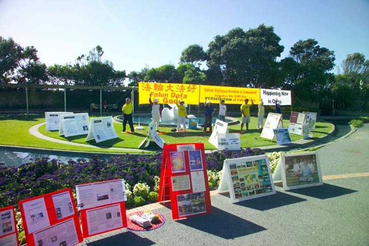 【明慧网2005年3月4日】每年2月新西兰内皮尔市都会举办Art Deco Weekend艺术节,来自全新西兰的数百辆老爷车云集内皮尔市,来自世界各地的游客们则穿起古典盛装感受这复古气氛。今年的艺术节人们欣喜的发现,十多位法轮功学员静静的炼功、发资料、讲真象、教功,这祥和美好的功法成为艺术节一道亮丽风景。