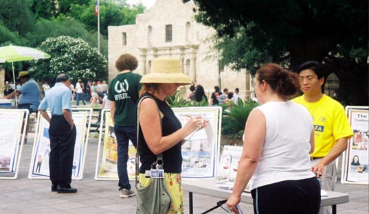沿场地四周排列的真象展板向人们讲述了法轮大法的洪传,中共江氏集团在中国对法轮功的迫害,在海外对法轮功学员的骚扰,以及法轮功学员全球范围的反迫害和各界对法轮功的声援。