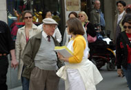 游行队伍行進途中许多市民在欣赏腰鼓和舞蹈队的表演后,更是认真的观看法轮功受迫害的真象展板。展板上展示出停止对法轮功的迫害和营救受迫害的法轮功学员和他们的孤儿的呼声。接看法轮功学员发的真象资料的人越来越多。