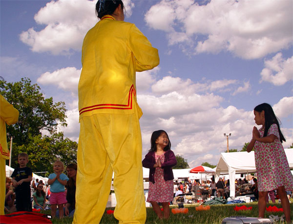 ![]() 法轮功学员演示功法 | ![]() 现场学功的小朋友 | ![]() 现场学功的小朋友们 |