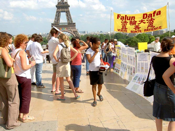 前来观赏埃菲尔铁塔的各国游客络绎不绝,但他们很快就被法轮功学员们在烈日下洪法体现出的庄严神圣所吸引。有许多人排着队要求签名声援反迫害,也有些人不顾天气炎热要求当场学功。学员们一一满足了他们的愿望,还与口渴的游客分享我们已经所剩无几的水。在短暂而又漫长的一下午,很多人亲手签下了他们的名字和他们支持法轮大法的善心。