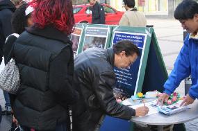 深感震撼的人们不停的问:“为什么还会有这样的事情发生?我怎样帮助你们?” 学员们回答着人们的提问,讲述法轮大法弟子在中国遭受中共迫害的始因,揭露中共恶党反人类的本质,唤醒人们的正义良知。明白了真象的人们,纷纷签名声援停止迫害。