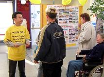 ![]() 人们边排队,边看法轮功真象,边等待学员给他们书写“世界需要真善忍”的祝福卡片 | ![]() 了解真象 |