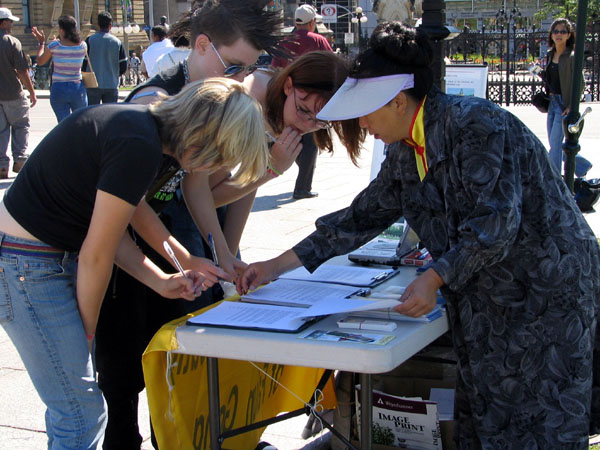 当善良的加拿大民众看到“反酷刑”展示后,主动签名支持法轮功并呼吁加拿大政府要求中共立即停止对善良人的迫害。