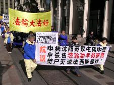 游行队伍以腰鼓队打头阵,继以“法轮大法好”、“真、善、忍”、法轮旗,及“法轮大法使亿万人身心健康”等横幅组成的方阵,后面紧跟着的是向民众讲述中共对法轮功的残酷迫害事实的讲真相方阵,并全程用英语和法语向人们介绍迫害真相,曝光苏家屯集中营的黑幕。在讲真相方阵中,身着素衣的数十位学员手捧着被中共迫害致死的大陆法轮功学员的遗像,庄重而肃穆;其后是“强烈呼吁联合国立即调查中共‘苏家屯集中营’杀人焚尸、售器官的暴行”等几十面横幅。