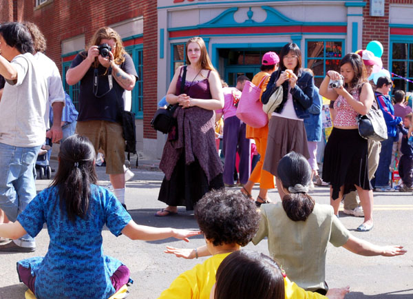 学员们不停的演示五套功法,人们不自觉的驻足,凝神观赏学员炼功,有的索性跟学员当场学功,有学员适时的解释功理,以便人们看的更明白。