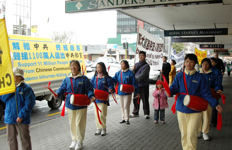下午的游行是在一处主要街道上进行的,过往车辆很多,许多人打开车窗索要资料,很多司机主动让出路来让游行队伍通过。
