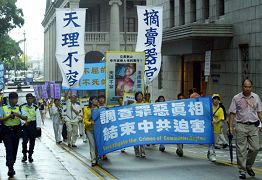 ![]() 香港学员在游行前的集会上宣读声明 | ![]() 法轮功学员顶住劲风在行进中 |