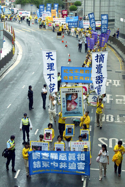 ![]() 游行队伍经过港岛中环区的中心地带 | ![]() 学员张起写着“法轮大法好”的大幡游行 |