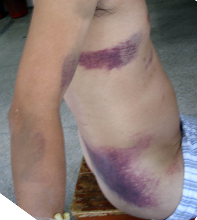 广东揭阳大法弟子黄涌忠被中共恶警绑架,非法判刑关到韶关监狱已5年多,2006年6-7间月被毒打,迫害致生命垂危,肝、肾等器官均严重损坏,恶警将他送到韶关医院检查,查出结果又不给治疗,连水,食物都不给吃喝,人在病床上还被铐成大字。手臂、大腿等处均有大片青紫瘀伤。眼看人都不行了,韶关监狱怕负责任,才通知家属领回。家属在领回送到市医院时,随车一恶警竟对主治医师说;“这个人是罪犯,能治就治,不能治就不要管他。”恶警这一番话,显露出共产邪党这几十年真是在把人变异成没有人性和良知的魔鬼。