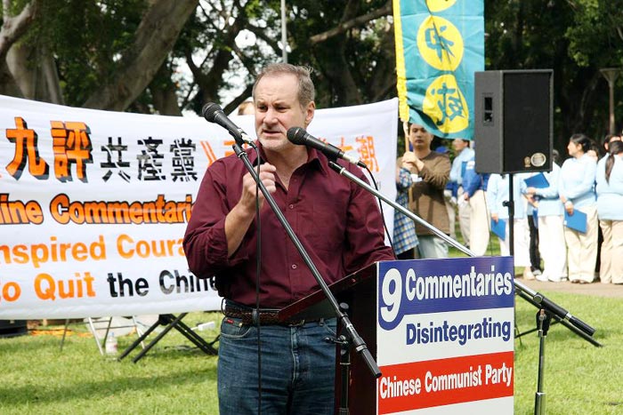 集会上,悉尼退党服务中心的高先生表示:两千万中国勇士冲破封锁,公开宣布退出中共邪党,中共邪灵的根都被拔起来了。