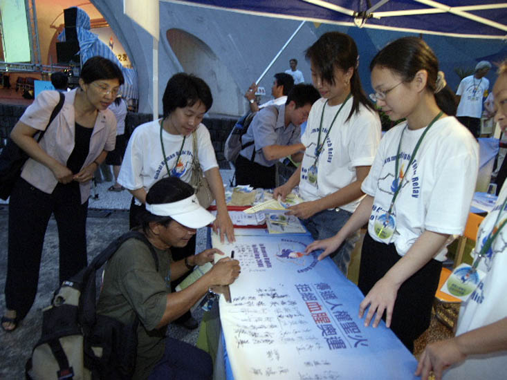 ![]() 响应八月九日人权圣火在雅典点燃,台北于十日晚间举行「人权圣火之夜」,呼吁人们共同努力,早日终止中共的迫害。(图为来宾与三十二位儿童共同传递烛光,代表人权圣火的光明到来) |