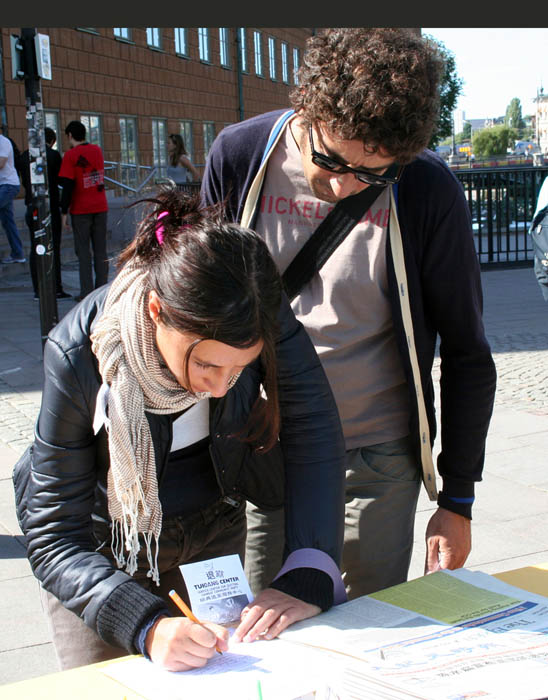 一位穿着讲究、满头白发的老人经过这里时,法轮功真相展板吸引了她。老人仔细的读了一遍,然后就和法轮功学员硕士生小刘聊了起来。原来这位老人的父母有一位好友一直生活在中国,他们有三个孩子,这三个孩子的中文比瑞典文讲的还好。她和他们经常联系。所以她对中国的问题比较清楚,她也很关心中国的人权状况。她对小刘说:“你们做这件事很值得。中国的现在的状况就是中共长期欺骗民众、封闭信息,给人们长期洗脑造成的。这就是共产集权的邪恶所在,它完全是靠谎言来维持着自己的统治地位。它的谎撒的使得头脑不是很清楚的人都分辨不出来是谁在撒谎了。”老人只知道共产党邪恶,但她还没想到会邪恶到这种程度:“把活人(法轮功学员)的器官就敢摘取,这简直是太残忍了!”她走到桌子前庄重的签下了自己的名字,表达自己支持法轮功,谴责中共的暴行。她还拿了瑞典文的《九评共产党》,表示回去要再好好的读读并讲给其他人。