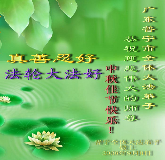 在二零零八年中秋佳节到来之际,我们中国大陆江苏常州大法弟子向您表示最真诚的祝愿!祝师尊中秋节快乐!我们一定做好三件事,走好正法修炼的最后这段路,救度更多的众生,完成助师正法的史前大愿,完成正法时期大法弟子的神圣使命!