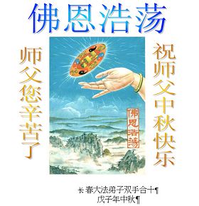 慈悲伟大的师尊:感谢您又一次给了我们救度众生的机会,给了我们提高的机会,给了众生得救的机会。我们谢谢您!再一次祝您中秋节快乐!
