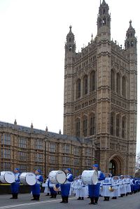 游行中,天国乐团走在法轮功游行队伍的最前面,引领乐队方阵的,是“法轮大法”和“真善忍”两个醒目横幅。在伦敦城最著名的街道上,乐团成员一路高奏“法轮大法好”、“法鼓法号”、“送宝”和“欢乐颂”。天国乐团震撼人心的鼓乐、乐团成员的精神面貌以及清新独特的蓝白两色仿古服饰使之成为所有游行参与者中的一大亮点,吸引了所有现场观众的注意力。