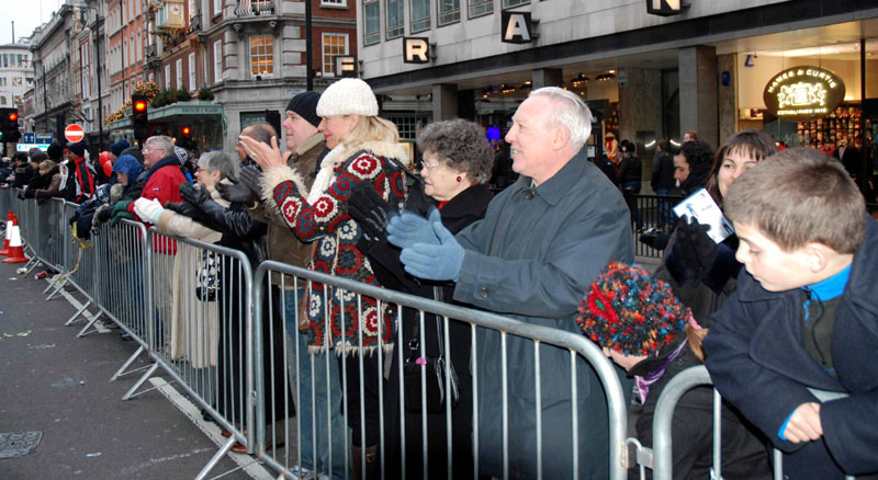游行线路上有多处搭建了临时观礼台,并布置了解说主持人,每个观礼台附近都是人山人海,在法轮功队伍经过这些地段时,几位解说主持人都带领观众欢迎法轮功的到来,并与法轮功学员互祝新年快乐!“法轮功队伍来了, 很高兴见到你们。” “太棒了,我们欢迎你们加入我们的表演。” 他们还向观众介绍说在世界上有七十多个国家有人修炼法轮大法、信仰“真善忍”,并一致评论法轮大法队伍与众不同的祥和宁静。“太宁静了,真是平静,整个队伍出奇的祥和”,“他们都让我平静下来了”,“我喜欢他们。”两个第一次为伦敦新年大游行做保安工作的年轻人欧马先生和凯伦女士告诉记者:法轮功团体的出场很漂亮,特别是他们的色彩太美了。