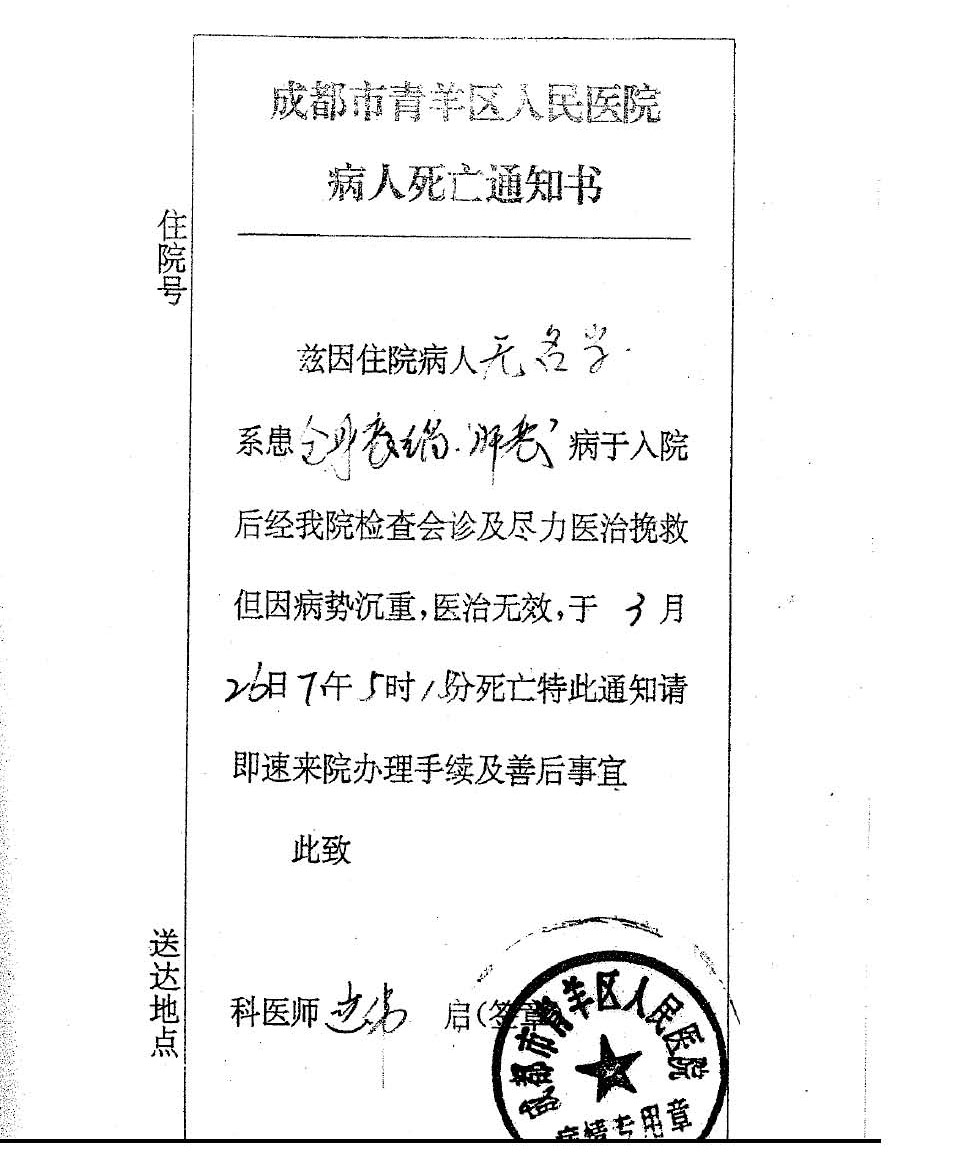 “病危通知书写的日期是二零零二年三月二十三日,病情是‘全身衰竭、肝衰’;死亡通知是三月二十六日。” 沈先生说:“但是没有人告诉我真实情况。”