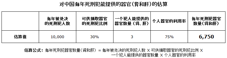 在前面我们用历史数据给出了死刑犯能提供的器官的大概数量,在6000例左右。下面我们再用估算公式来计算一下,看看每年死刑犯到底能提供多少器官。相关的变量包括: