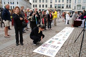 在集会的同时,法轮功学员进行了真相图片展和反酷刑真人模拟展。来自挪威的老年女学员与一位得法修炼刚三个月的新学员扮演被迫害的大法弟子和中共恶警。当恶警恶狠狠地迫害关在笼子里的大法弟子时,大法弟子高声喊着“法轮大法好!”由于他们用心在表演发生在中国的迫害情形,这个逼真的场面牵动了许多路人的心。一位丹麦妇女激动地冲到“恶警”面前,大声质问,她对受到迫害的无辜的法轮功学员的关切之心,使得她一时忘记了这是模拟表演。