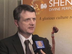![]() 欧洲议会议员杰格拉德·贝谭先生(Gerard Batten)在二零零九年神韵演出期间接受媒体采访。 |