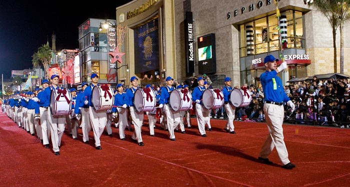 二零零七年十一月二十五日晚,美国好莱坞举办圣诞大游行,精神抖擞的天国乐团,展现法轮大法修炼者的风采。