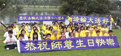 【明慧网二零一零年五月十日】今年五月十三日是法轮功(也称法轮大法)开传十八周年纪念日、第十一届“世界法轮大法日”,也是法轮功创始人李洪志先生五十九岁华诞。二零一零年五月八日,台湾宜兰县法轮功学员在知名的旅游景点罗东运动公园集体炼功与表演腰鼓,传递法轮大法的祥和美好,除了表达学员感念师尊传法的洪恩、互勉精进修炼,也希望让更多民众关注中国大陆法轮功学员受迫害的真相,呼吁各界人士共同制止这场迫害。