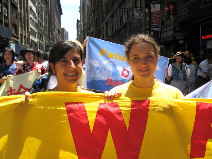 ![]() 辛迪(左)在纽约曼哈顿参加法轮大法日集会 |
