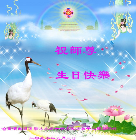 值此普天同庆5.13---世界法轮大法日盛会之时,我们辽宁朝阳大法弟子也献上自己的一份心意,并且向我们慈悲伟大的师尊问好,恭祝师尊生日快乐!