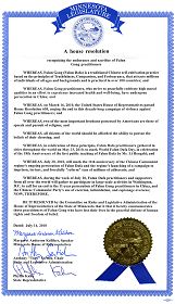 美国明尼苏达州众议院规则和行政委员会于二零一零年七月十四日通过决议,纪念为和平捍卫人权和信仰自由而失去生命的法轮功学员。