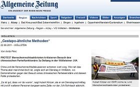 活动也吸引了媒体的关注,当地一家媒体《莱美汇报》(Allgemeine Zeitung Rhein Main Presse)派记者采访,并以《盖世太保的方式》为题目报导了这次人权抗议活动。文章中说:中国和其人权讨论看上去离我们(德国)很遥远,但周二在威勒斯坦监狱又告诉我们,这个话题离我们有多近。国际人权组织德国分部董事会成员库伯尔先生表示,十多年来这个办公室(六一零)一直在打压和迫害法轮功,“他们把法轮功视为一种威胁,并开始对这些和平的人进行迫害,法轮功是一个锻炼心身的团体。”